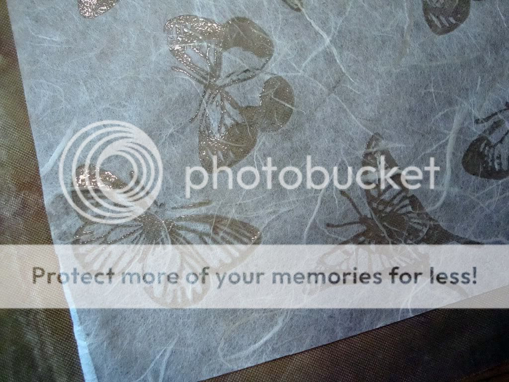 I cut a sheet of the mulberry paper in half and used Versamark to ink up some Martha Stewart butterfly clear stamps. I randomly stamped them all over the mulberry paper.